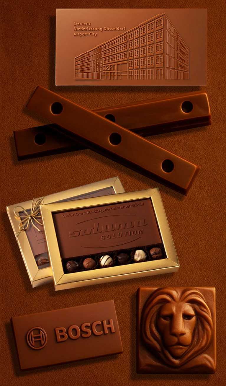 Ob klassisches Firmenlogo, detailgetreue Produktnachbildung oder ein kreatives Wunschmotiv – wir fertigen Ihre Schokolade ganz nach Ihren Vorgaben.