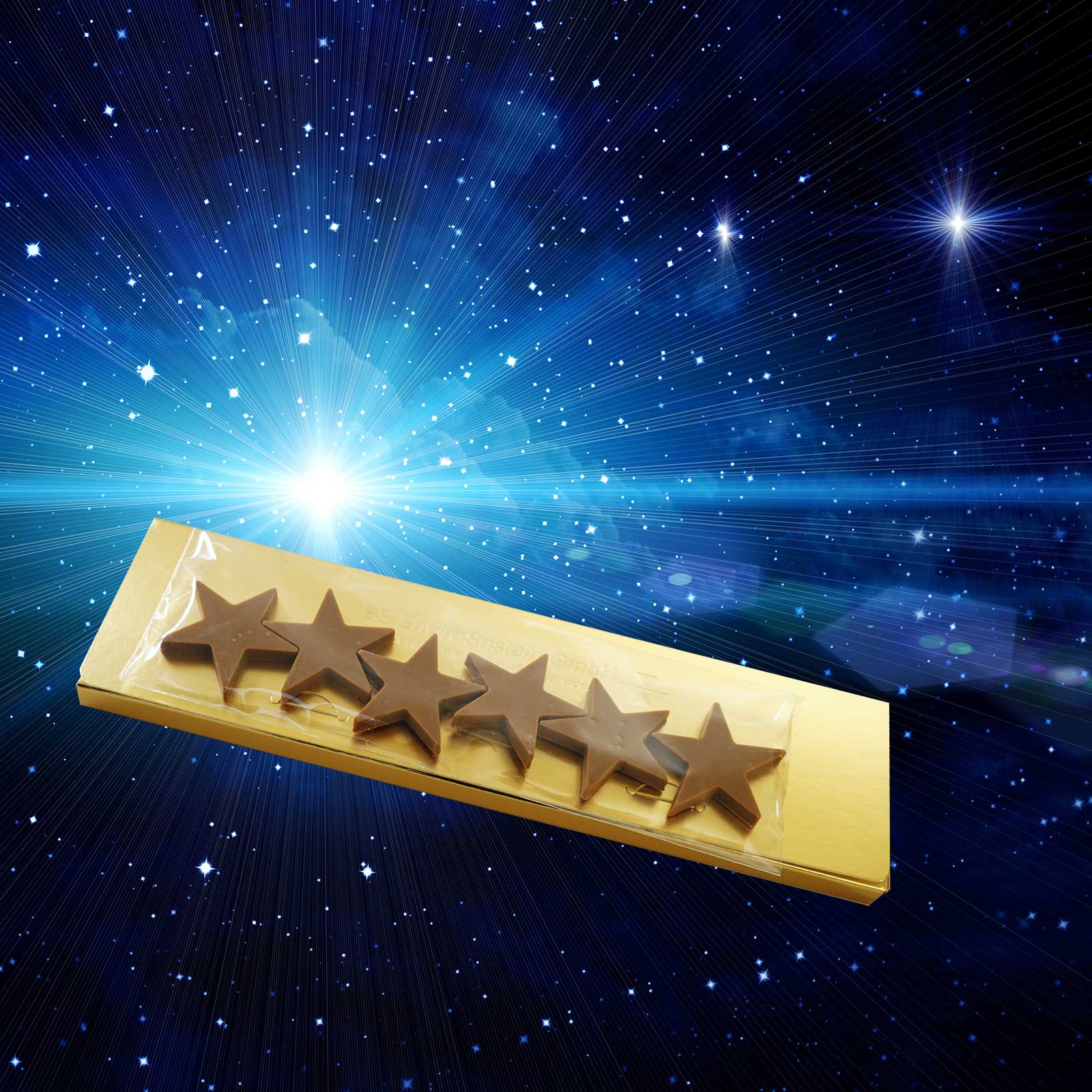 Aus diesem Gedanken entstand auch die neue, innovative Produktreihe von Schokologo: der Sternenhimmel (im Bild). Mehrere Schokoladensterne, zusammen eingeschweißt in Folie, werden präsentiert in einer edlen Geschenkbox. Selbstverständlich haben Sie auch hier die Qual der Wahl – bei der Größe und Anzahl der Sterne sowie der Beschaffenheit der Schachtel.