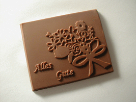 Übrigens: Natürlich können Sie die Schokolade auch ganz individuell nach Ihren Wünschen mit Ihrem Logo oder Ihrem Slogan gestalten. Schokologo verfügt auch über die technischen Voraussetzungen und die Fähigkeit, Ihnen kreativste und ungewöhnliche Sonderformen aus Schokolade anbieten zu können.