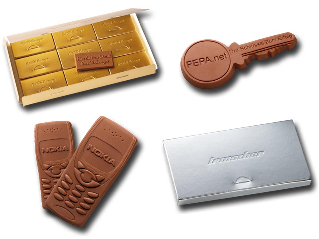 Weil wir unsere Produkte lieben, möchten wir, dass sie schön werden. Wir setzen alles in Schokolade um, was möglich ist – Logos, Schriften und auch Produktnachbildungen wie Kugellager, Handys, USB-Sticks, CDs und Schlüssel. Die fertigen Schokoladen sind in 2,5-D, denn die Rückseite ist immer flach. Von oben erkennt man die Dreidimensionalität, die als Wiedererkennungswert des nachgebildeten Produktes genügt. Wir bieten auch individualisierte Verpackungen an. Entweder 4c-bedruckt nach der individuellen Layoutvorlage des Kunden oder geprägt. Prägungen wirken sehr hochwertig und verleihen dem Produkt einen edlen Charakter. Denn die Marke des Unternehmens wird auf eine besondere Art und Weise hervorgehoben.
