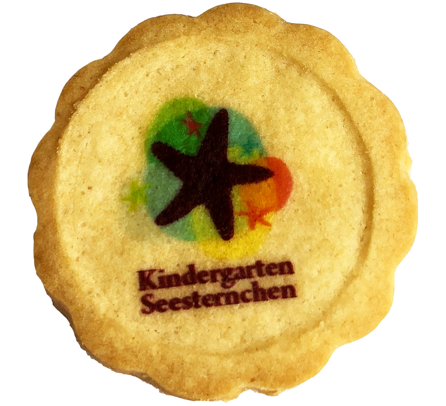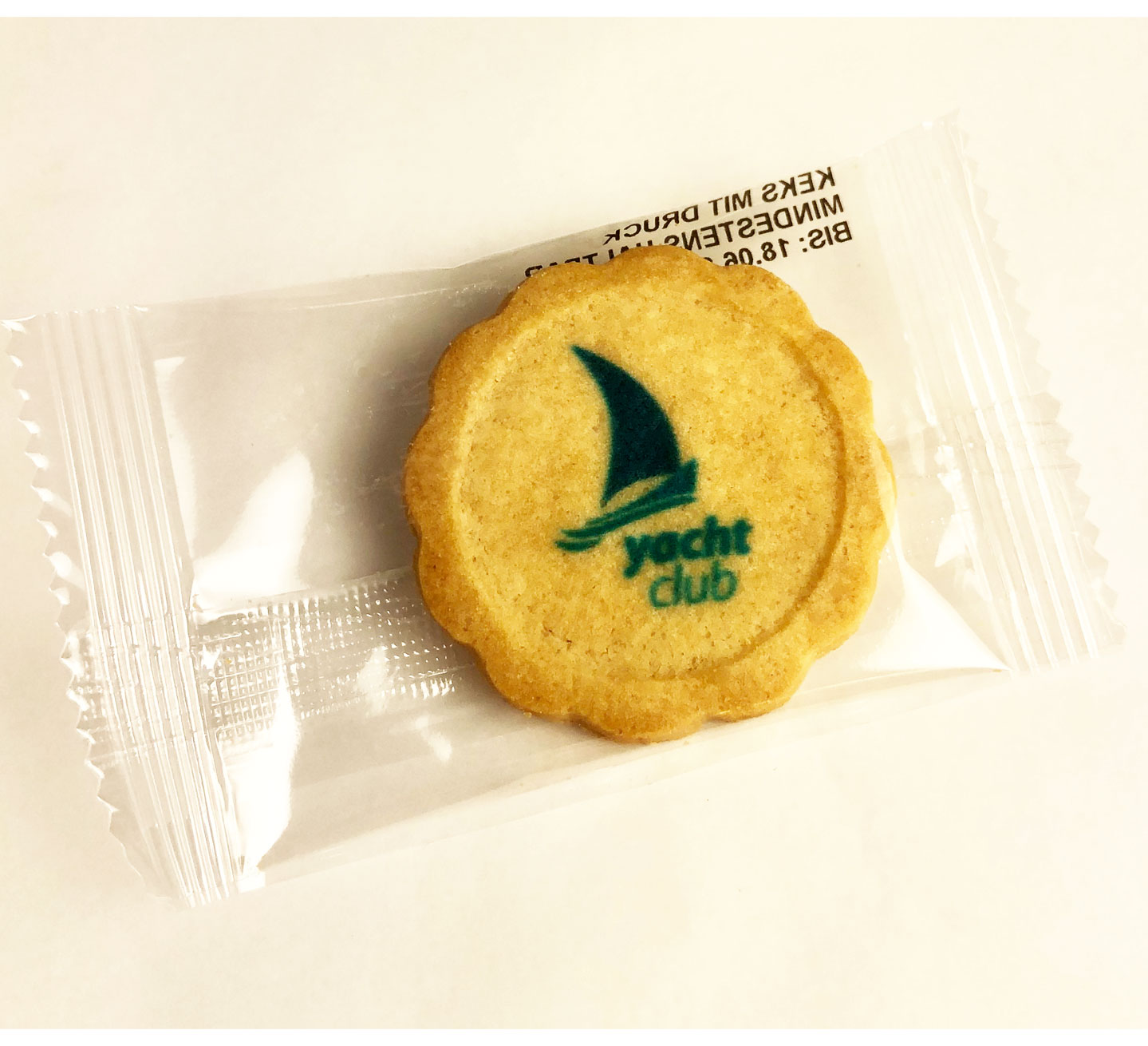 Ein runder Keks aus Mürbegebäck wird farbig mit Ihrem Logo und Ihrer Werbung mit Lebensmittelfarben bedruckt. Einzelverpackt in Klarsichtfolie. Weitere Geschmacksrichtungen auf Anfrage.