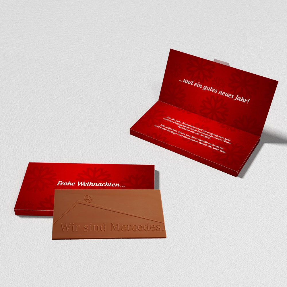 Sowohl die Schokolade als auch die Grußkarte werden nach Ihren Vorgaben geprägt und bedruckt.