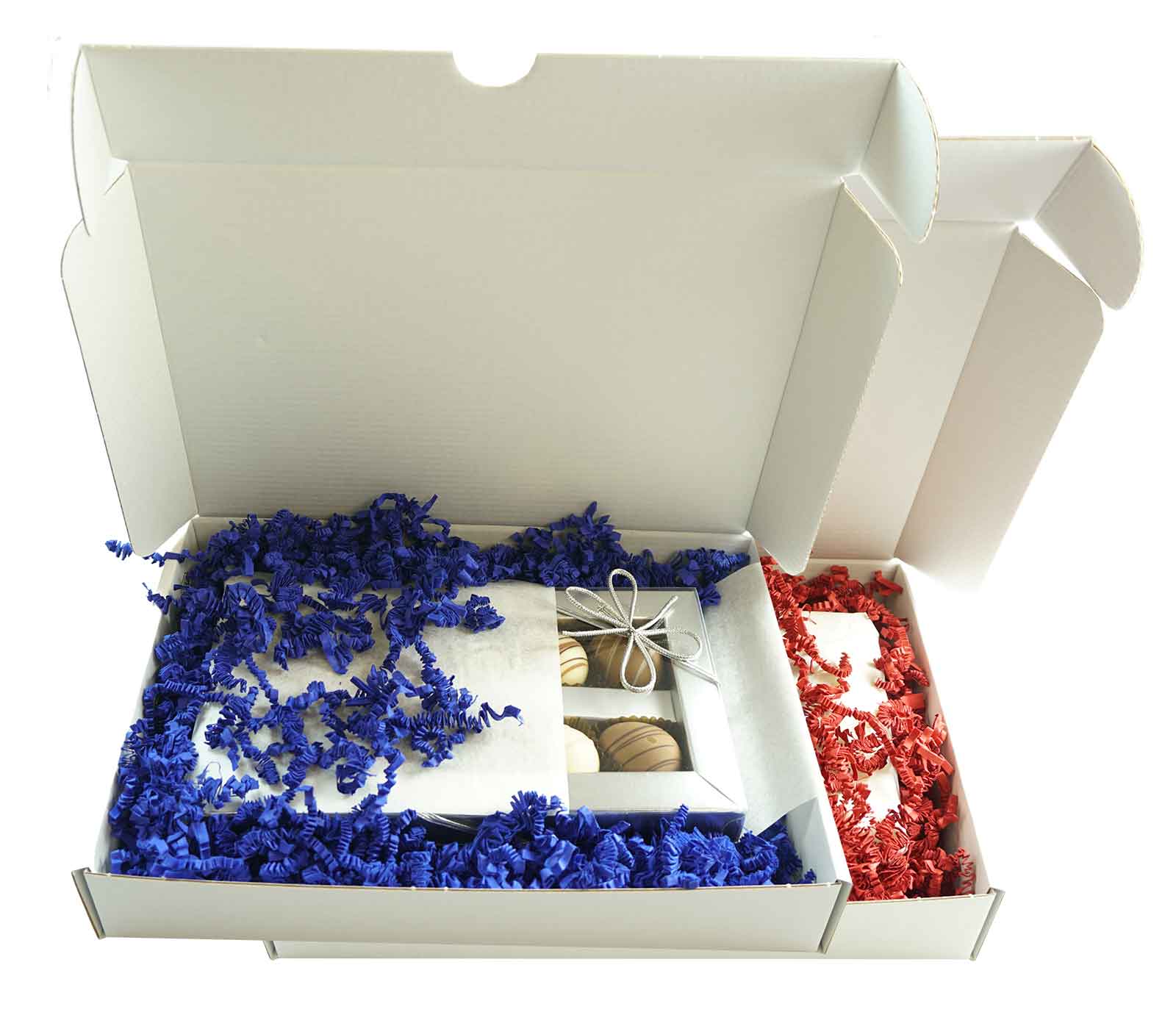 Das Füllmaterial „SizzlePak“ ist ein dekoratives, loses Papiermaterial mit Stoßschutz und in den Farben rot und dunkelblau erhältlich.