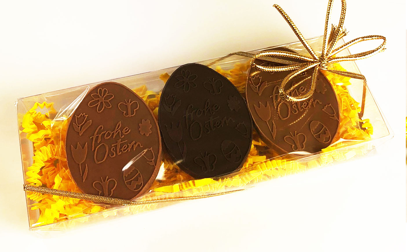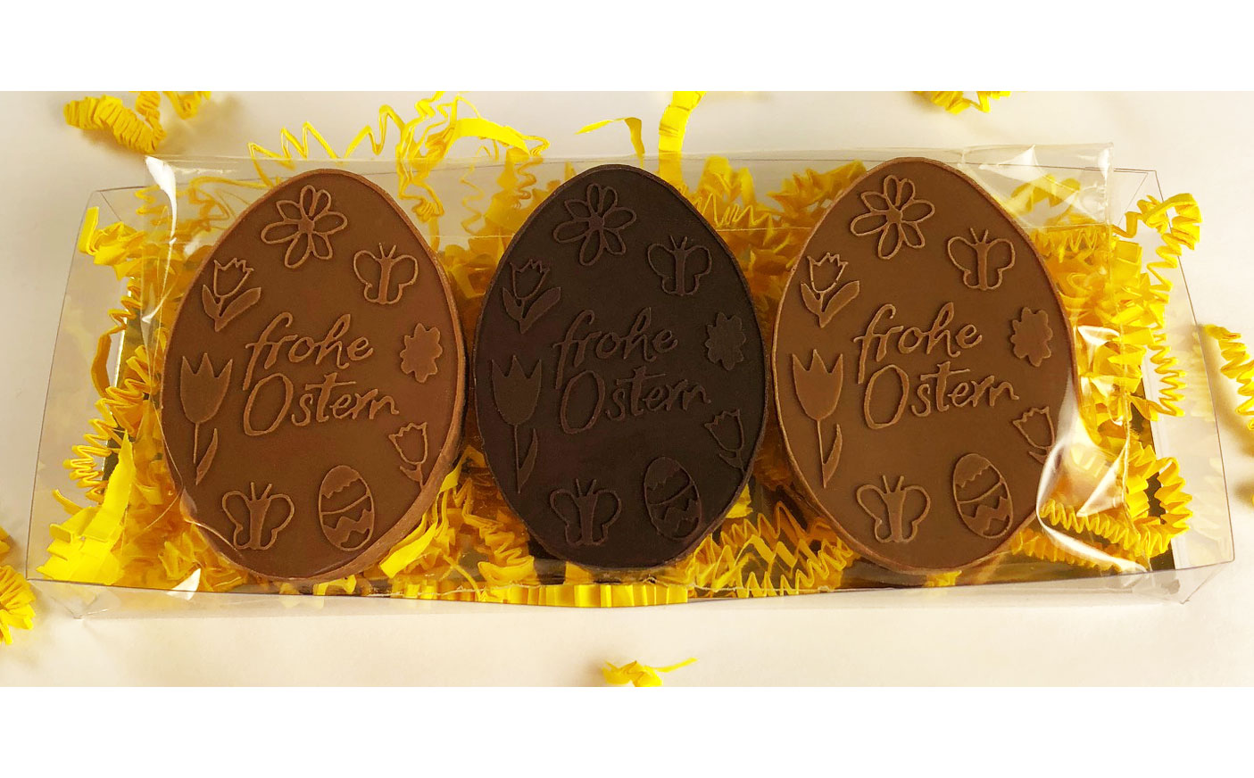 Zwei oder drei eiförmige Schokotäfelchen je 60x40mm verpackt in einer Klarsichtbox mit SizzlePak Deko.