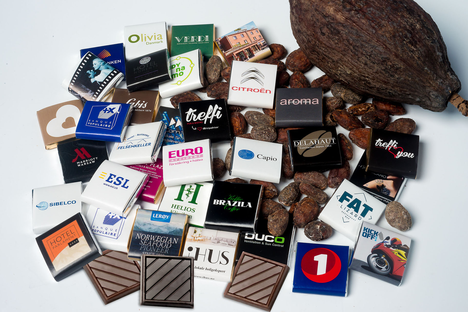 Feinste Belgische Schokolade, verpackt in silberner Alufolie und mit individuell bedruckter Papierbanderole umwickelt.