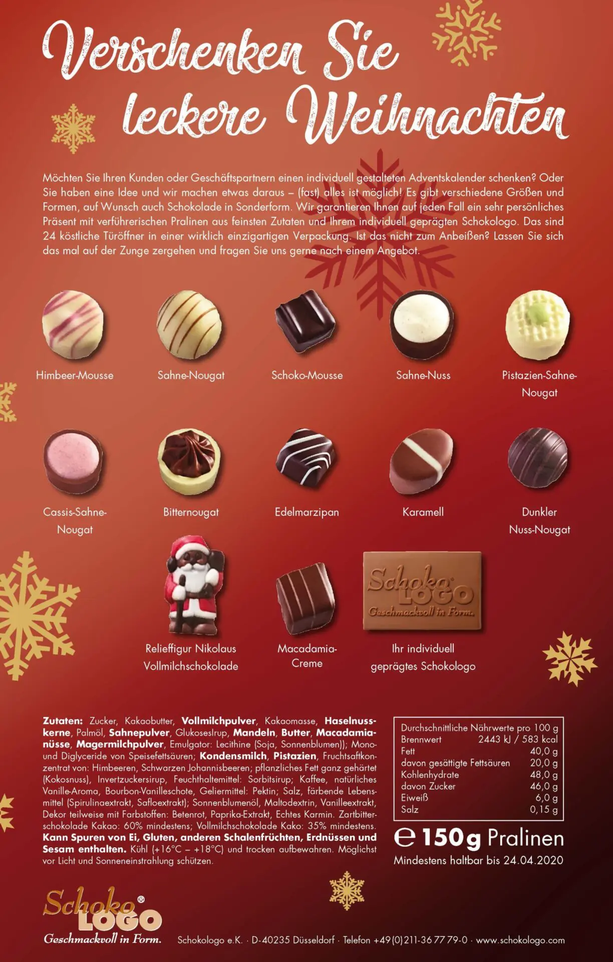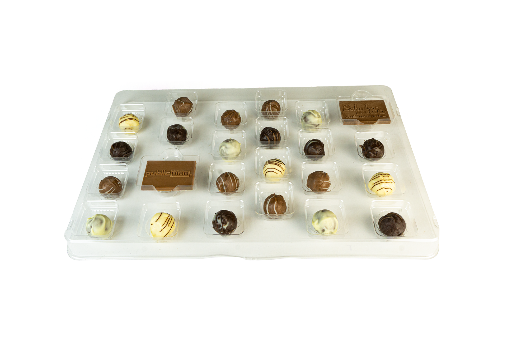 Der Kalender wird mit 22 Pralinen-Trüffeln befüllt, einem süßen Schoko-Nikolaus und einem geschmackvollen Schoko-Täfelchen mit Ihrem Logo.