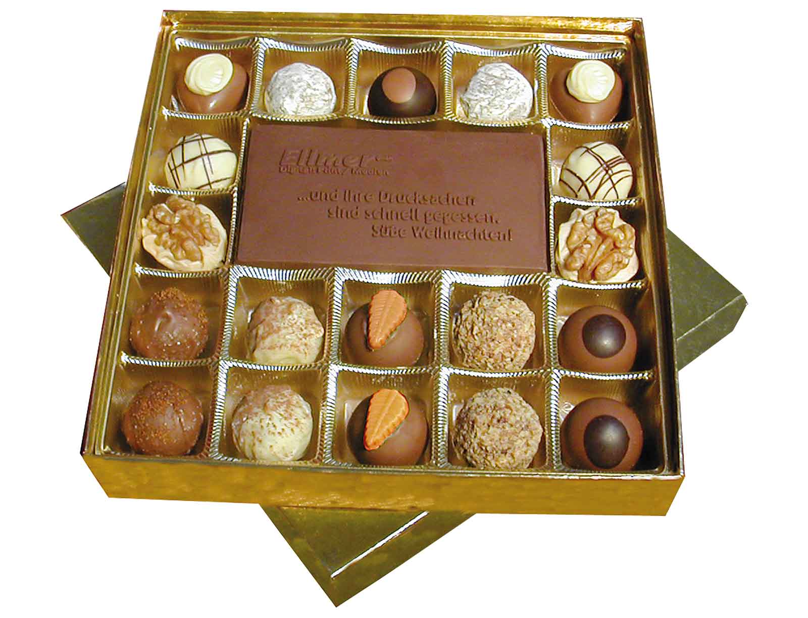 Ihr Logo in Schokolade umrandet von 19 exquisiten Pralinen in einer stabilen Karton-Schachtel.