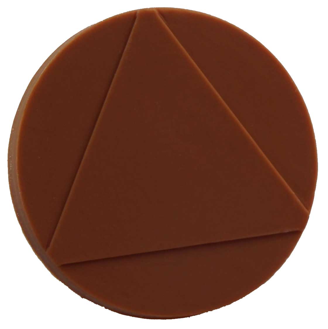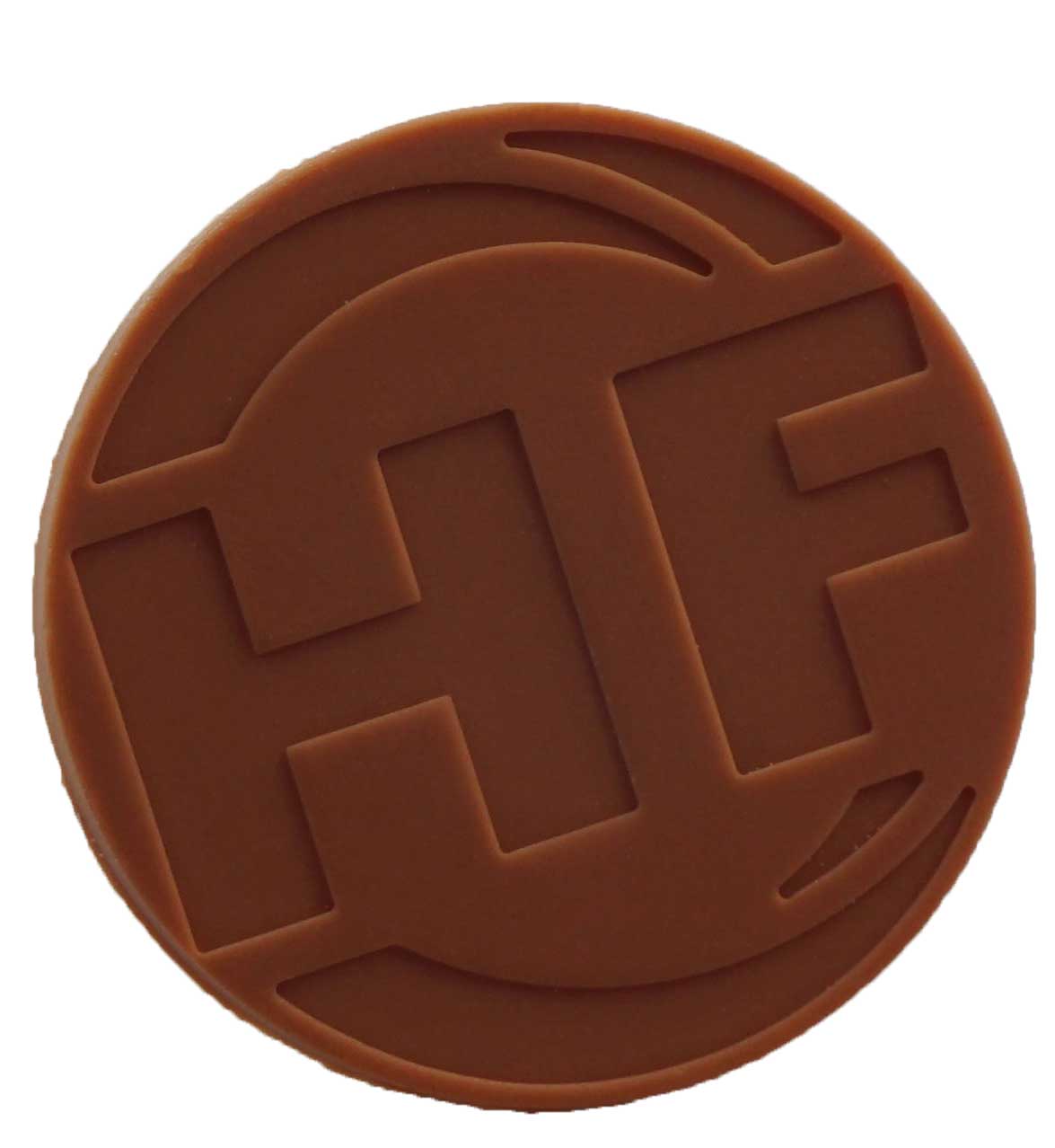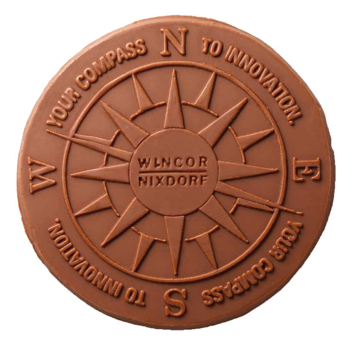 Klassiche runde Schokologos, einseitig geprägt: 40mm, 50 mm, 75 mm, 90 mm, 120 mm und 140 mm Durchmesser.