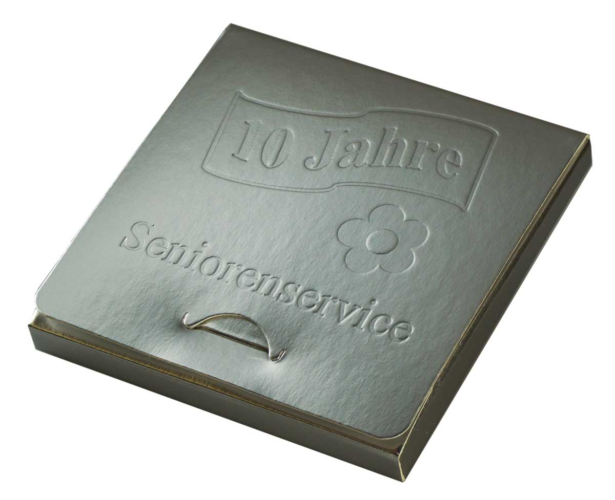 Diese runden Schokologos werden einzeln eingeschweißt in Klarischtbeutel (Flowpack) und optional einzeln in geprägten quadratischen Schachteln eingepackt werden können.