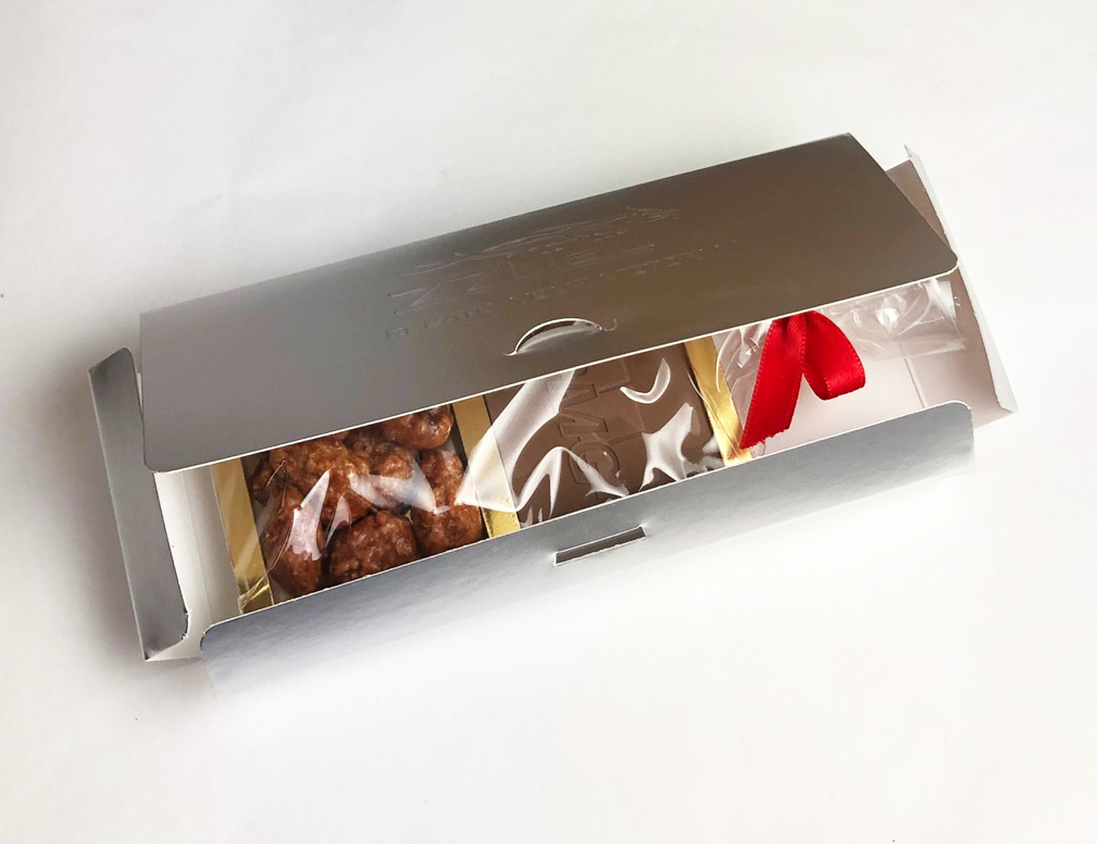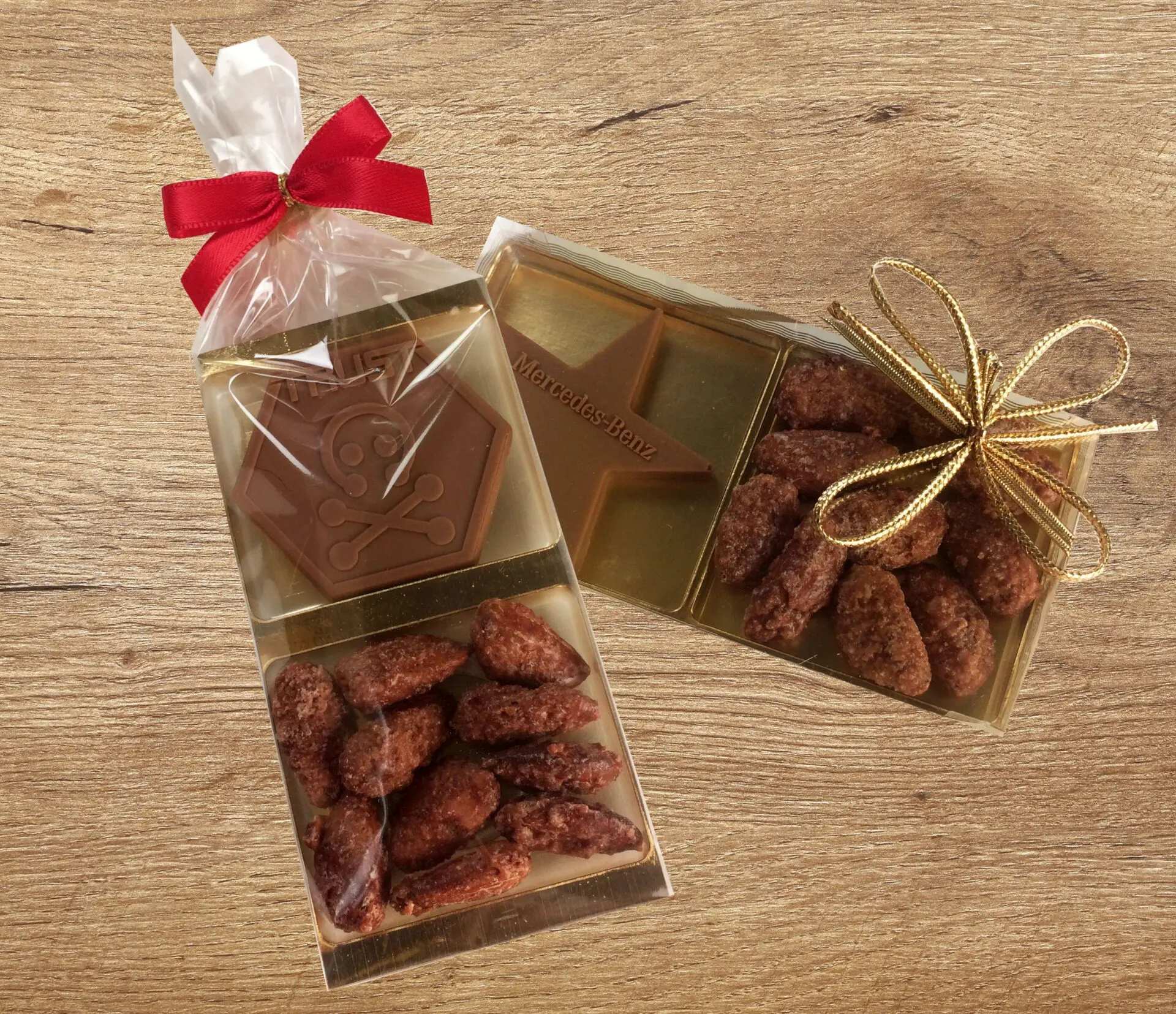 Eine Individuelle Schokolade mit Ihrem Logo oder in Sonderform in Kombination mit Gebrannte Mandeln.