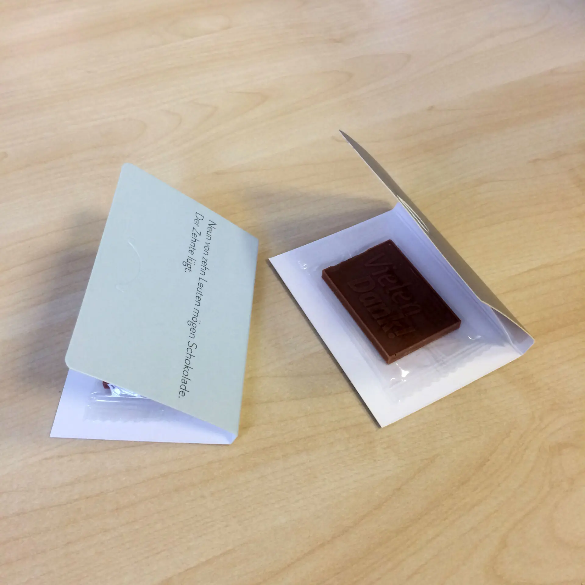 Ein individuelles Schokologo wird in ein Kartonetui aufgeklebt, welches einen Schlitz für die Befestigung Ihrer Visitenkarte bietet.