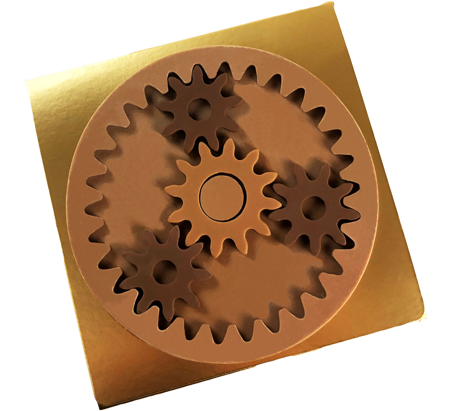 Vier bewegliche Zahnräder aus Schokolade lassen sich im Tandem spielen.