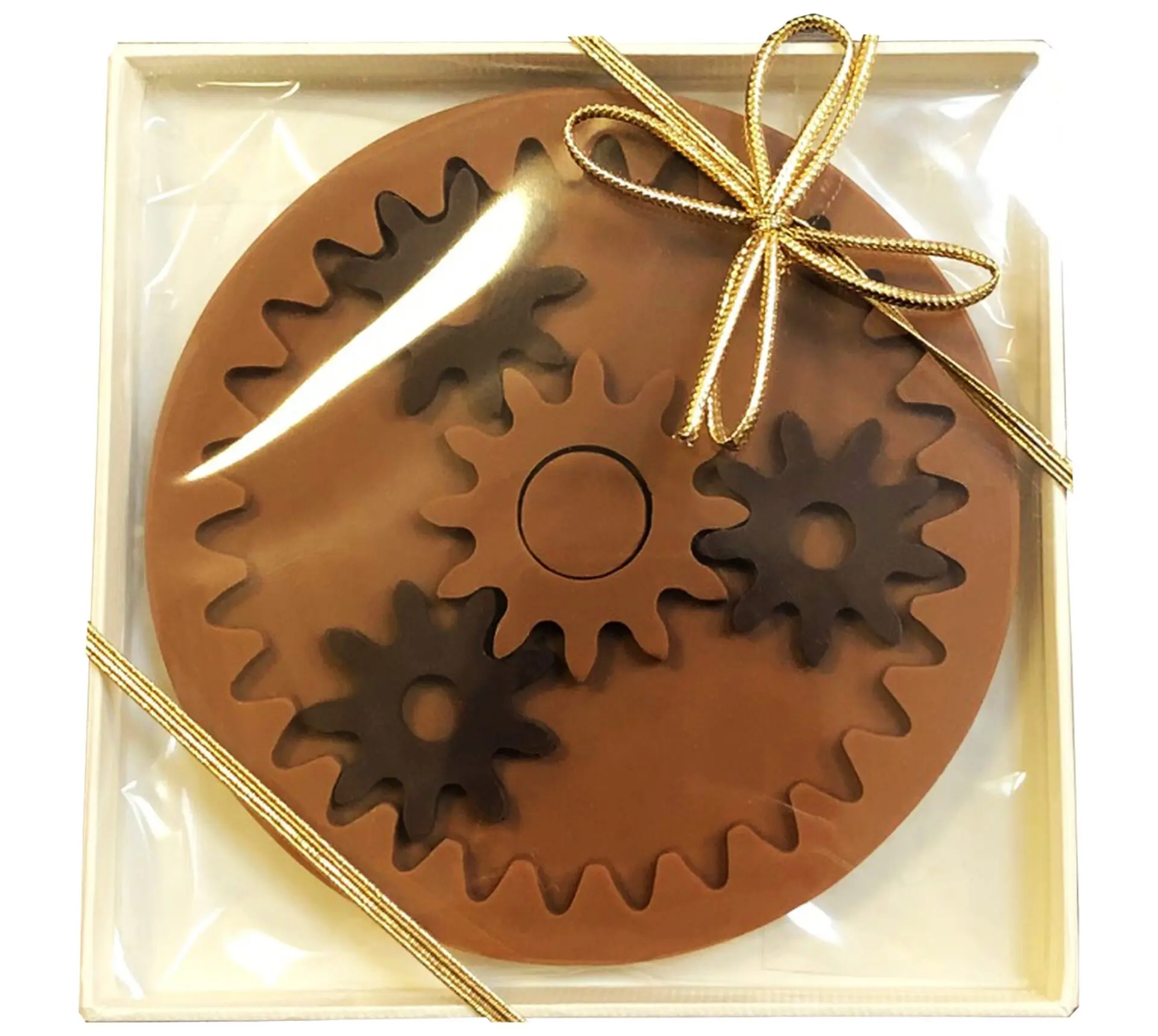 Schoko-Zahnrad, Schoko-Getriebe, Kunst aus Schokolade, Schokoladenspielzeug, Spielzeug aus Schokolade.