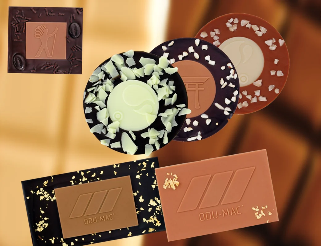 The selection is so vast it’s hard to describe – from small, circular design chocolate coins (outer ring 50 mm Ø / inner part 40 mm Ø) to design chocolate squares (75 x 75 mm / 40 x 40 mm) and large, rectangular design chocolate bars (210 x 130 mm / 110 x 60 mm). The mix of delicious chocolate varieties like milk, dark, and white chocolate between the inside and outside gives the products an outstanding appeal.